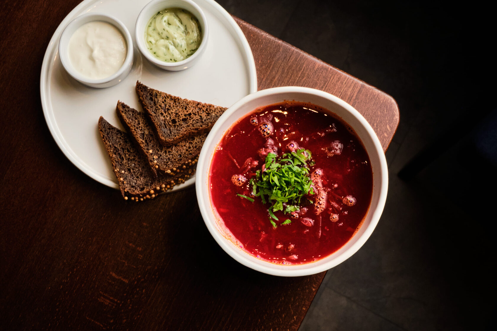 В тарелке борща — густая свекольная глубина, мясо, которое тает, и ложка сметаны ровно в центр. Том-ям балансирует на грани острого и нежного: пряный бульон, кокосовое молоко и те самые морепродукты, что только что плавали в аквариуме. Гороховый встречает копченым дымком и греет основательно, без суеты. А куриный — прозрачный, с золотистым отливом, легкий и согревающий — когда хочется просто и по-домашнему. Под настроение, под компанию, под любую погоду.